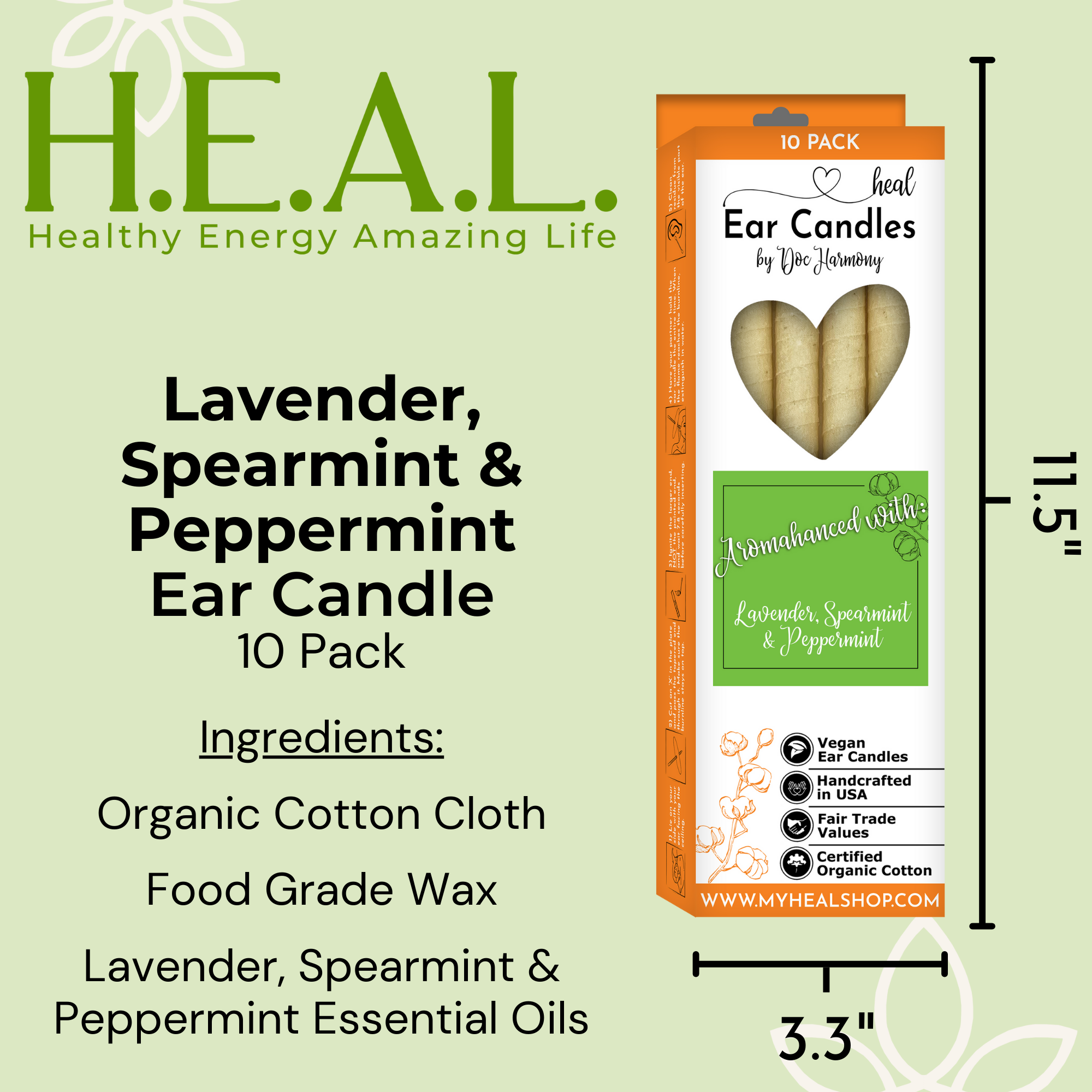 Harmony’s Famous Lavender, Spearmint & Peppermint Handcrafted, Organic Ear Candles are 10″ long and approximately 1/2″ in diameter. They are made with certified ORGANIC cotton cloth and food grade wax. Aromahanced with lavender, spearmint, and peppermint essential oils.