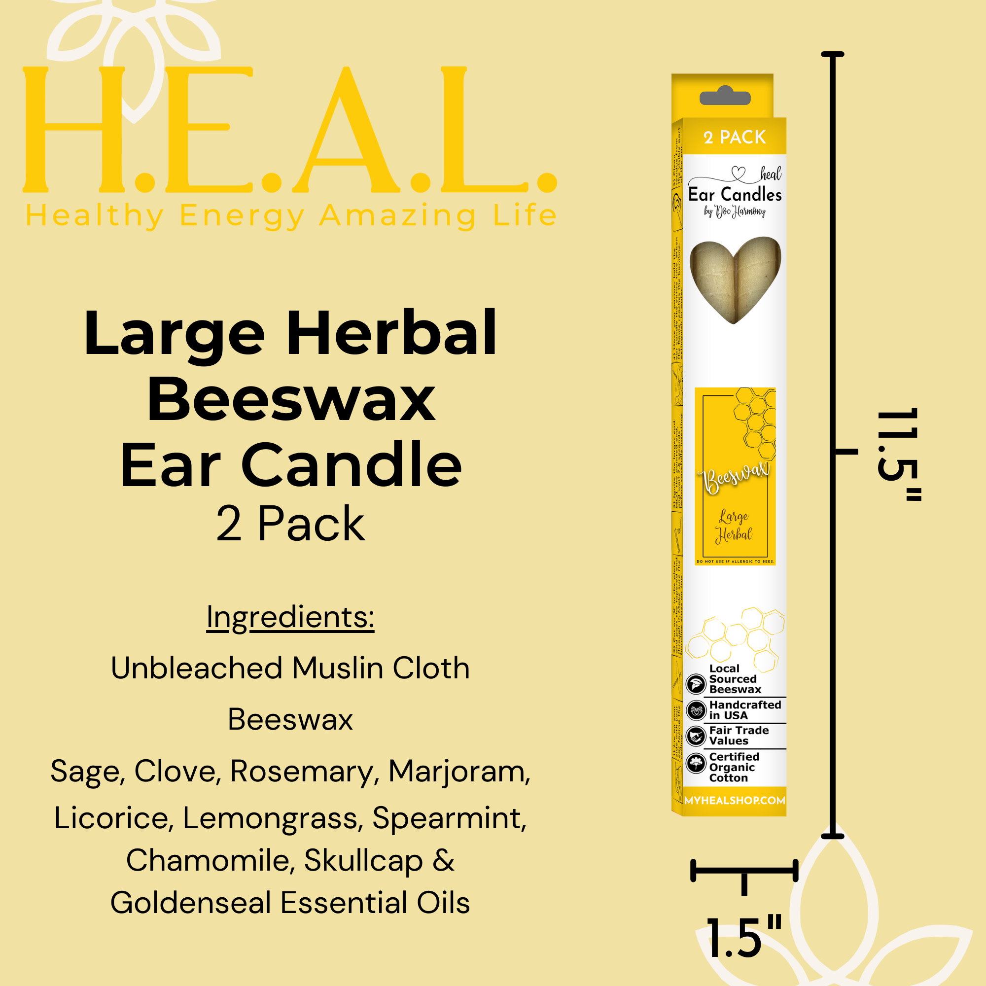 Harmony’s Famous Large Beeswax Handcrafted Ear Candles are 10″ long and approximately 3/4″ in diameter. They are made with unbleached muslin cloth and beeswax.