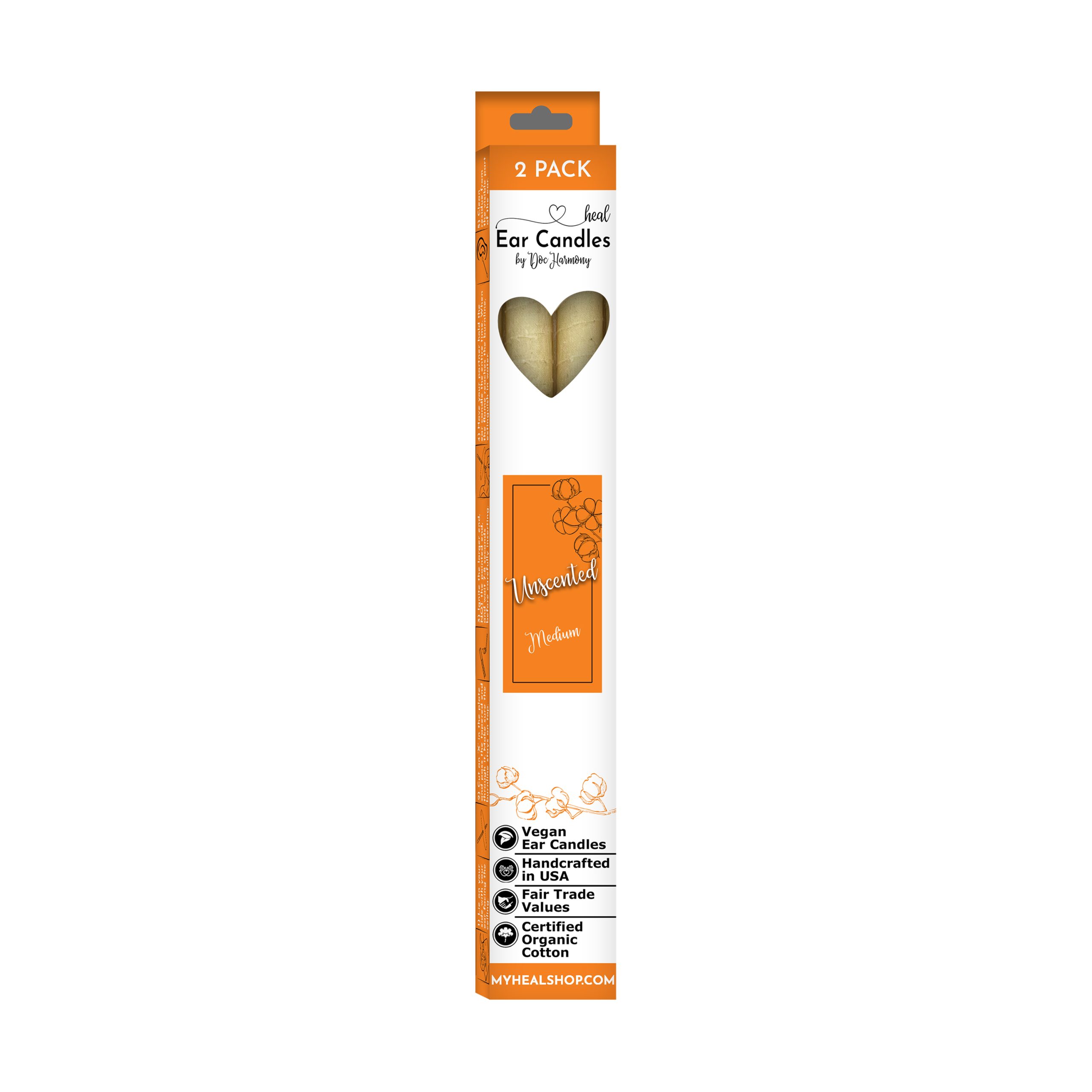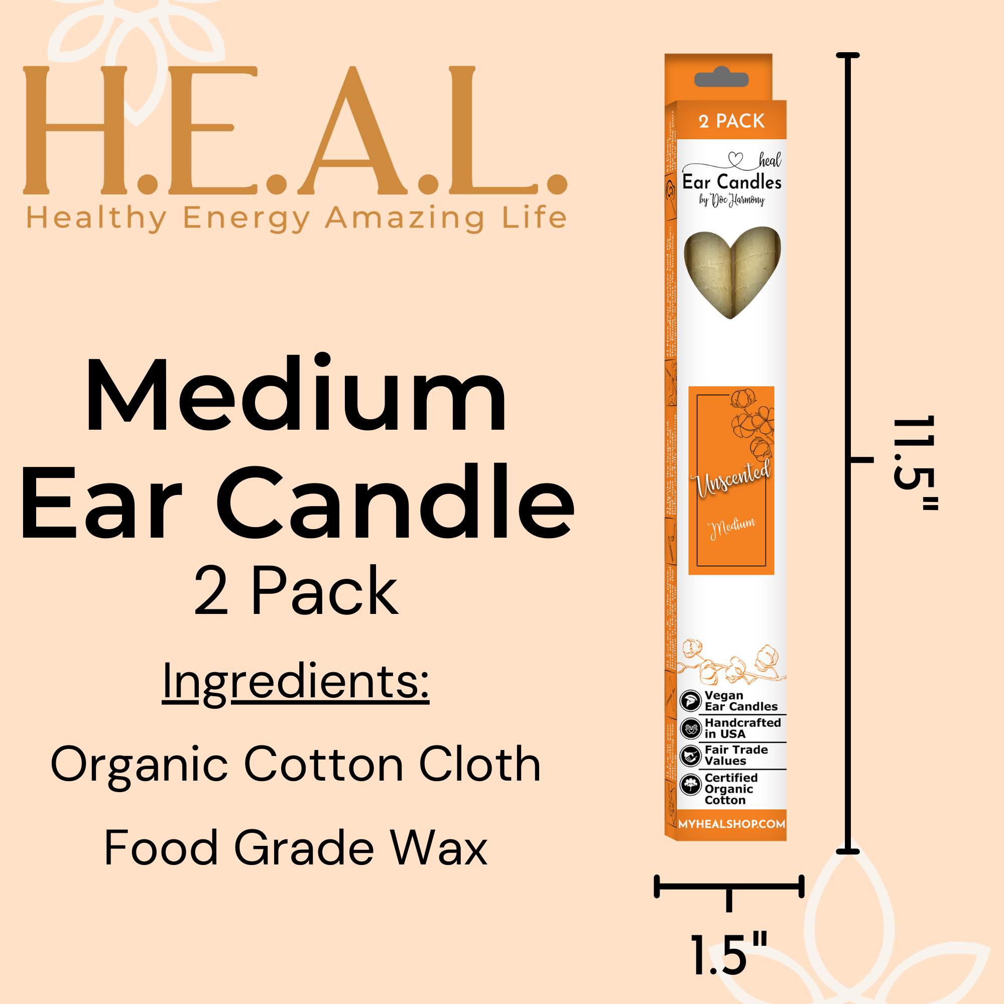 Harmony’s Famous Medium Handcrafted, Organic Ear Candles are 10″ long and approximately 5/8″ in diameter. They are made with certified ORGANIC cotton cloth and food grade wax.