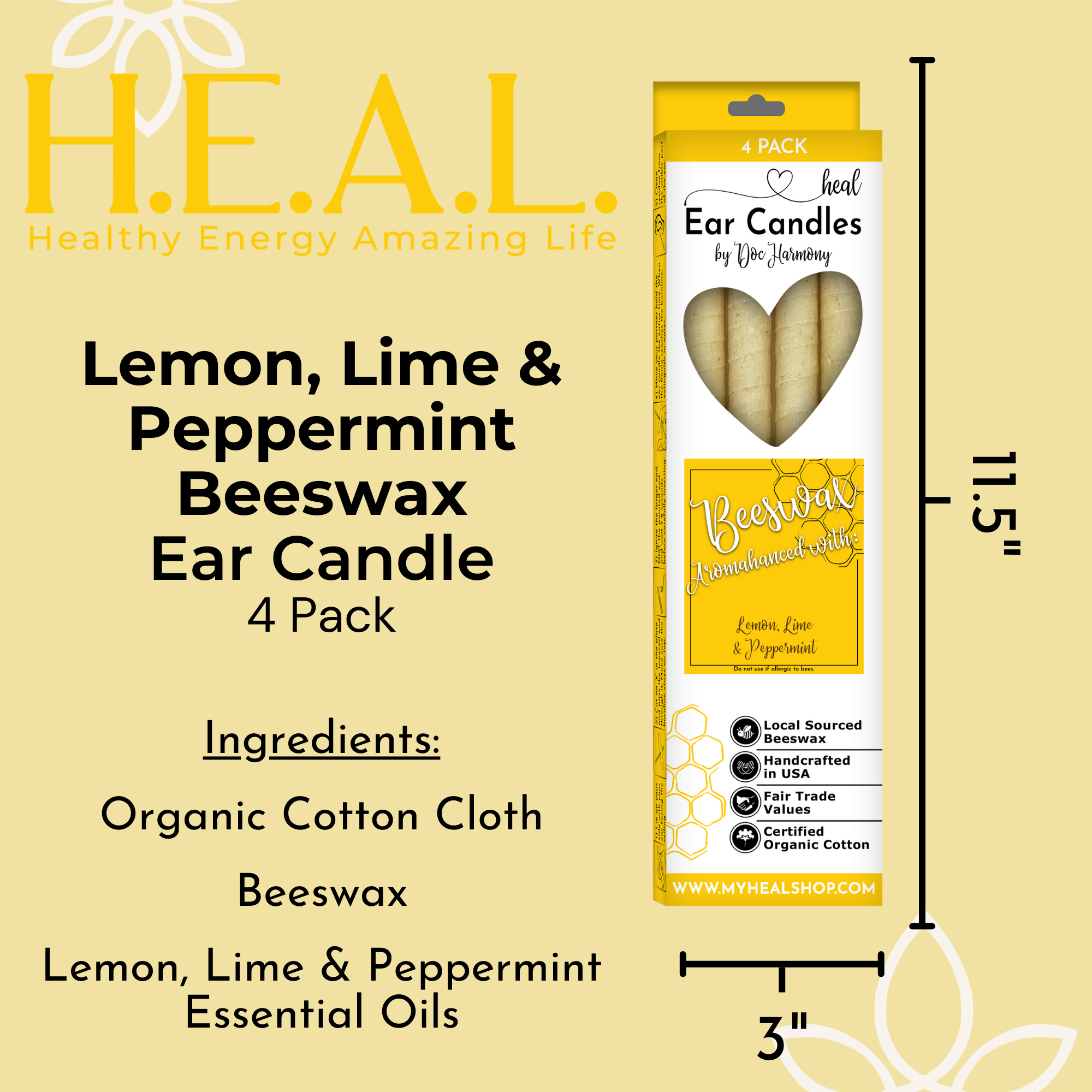 Harmony’s Famous Lemon, Lime & Peppermint Beeswax Handcrafted, Organic Ear Candles are 10″ long and approximately 1/2″ in diameter. Ingredients include certified ORGANIC cotton cloth and locally acquired beeswax. Aromahanced with lemon, lime & peppermint essential oils.
