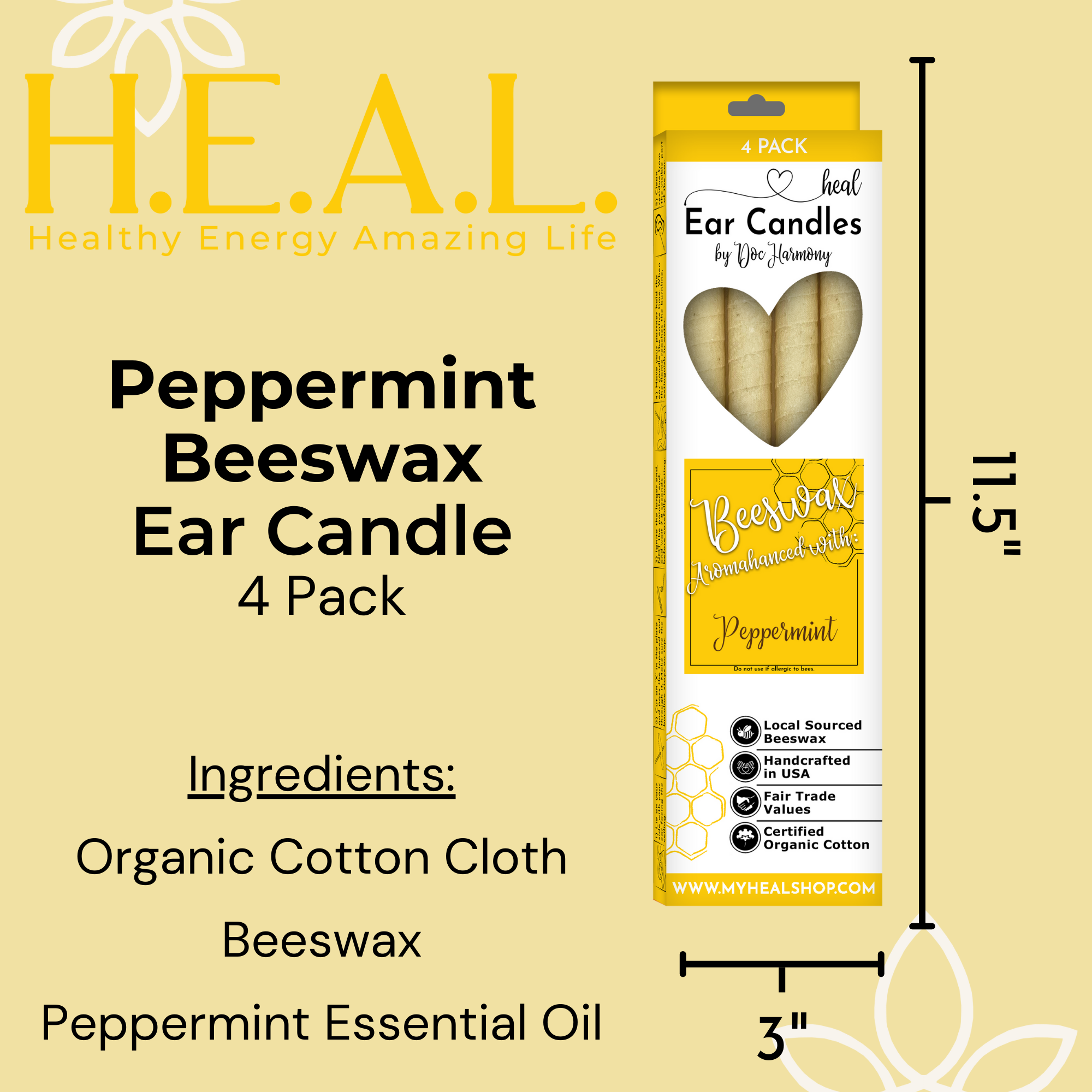 Harmony’s Famous Peppermint Beeswax Handcrafted, Organic Ear Candles are 10″ long and approximately 1/2″ in diameter. Ingredients include certified ORGANIC cotton cloth and locally acquired beeswax. Aromahanced with peppermint essential oil.