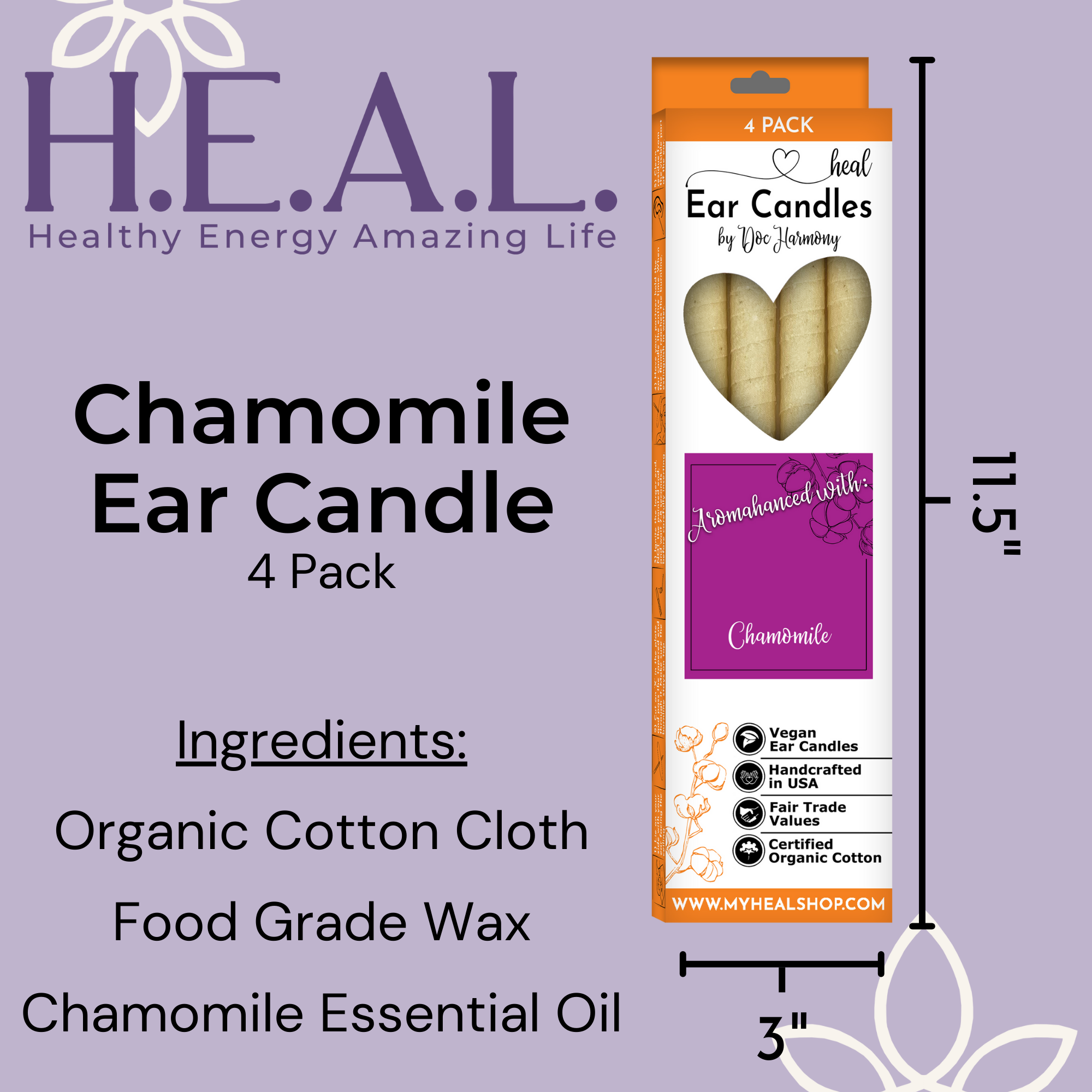 Harmony’s Famous Chamomile Handcrafted, Organic Ear Candles are 10″ long and approximately 1/2″ in diameter. They are made with certified ORGANIC cotton cloth and food grade wax. Aromahanced with chamomile essential oils.