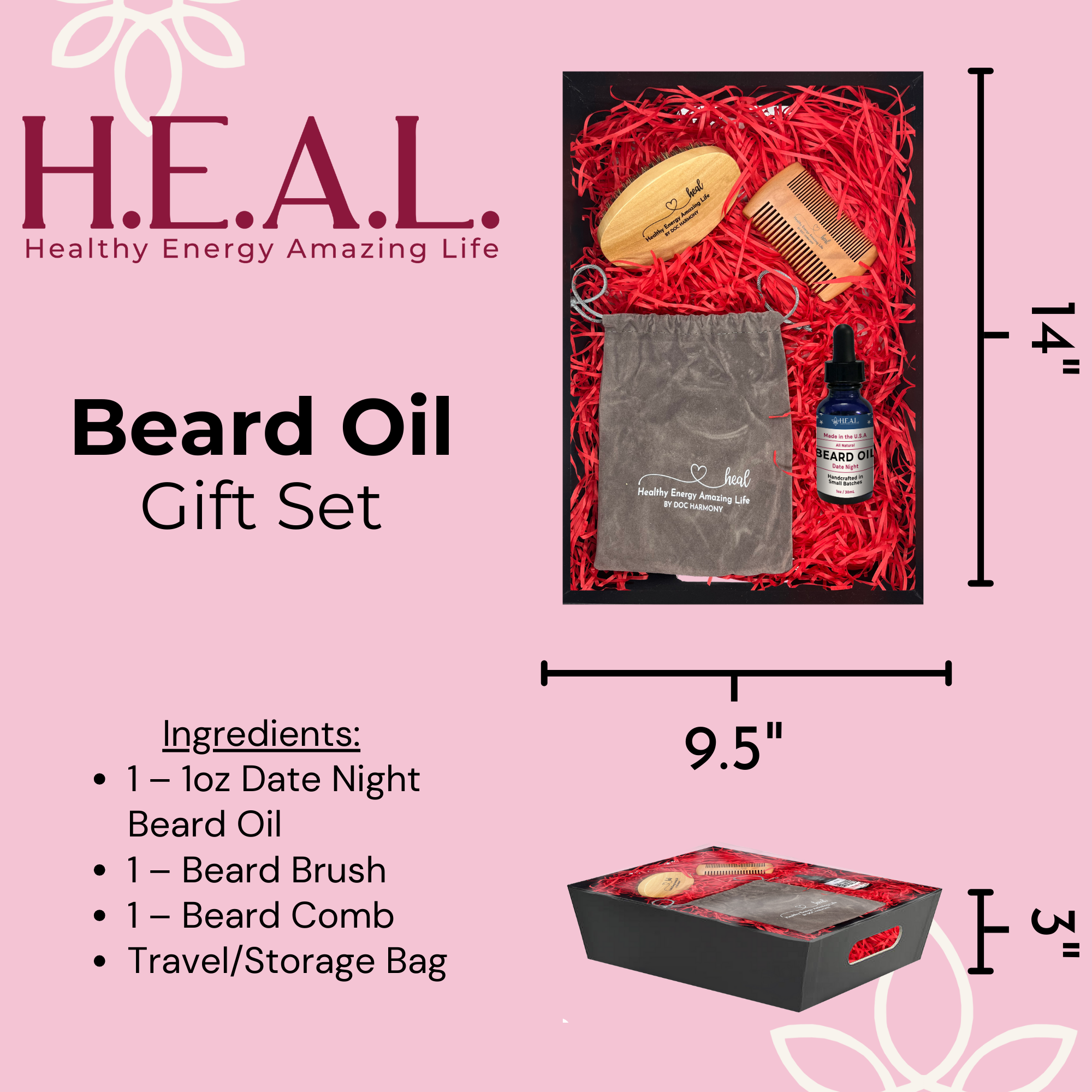 Harmony’s Beard Oil Gift Set includes: 1- 1oz Date Night Beard Oil, 1- Beard Brush, 1- Beard Comb, and a convenient Travel/Storage Bag.